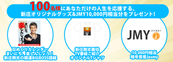 | プレゼント内容 | 以下3点をセットでプレゼント ・新庄オリジナルグッズ 日めくりカレンダー「まいにち、楽しんじょう!」 ・新庄オリジナルグッズ 新庄剛志画伯オリジナルTシャツ ・10,000円相当のJMY |