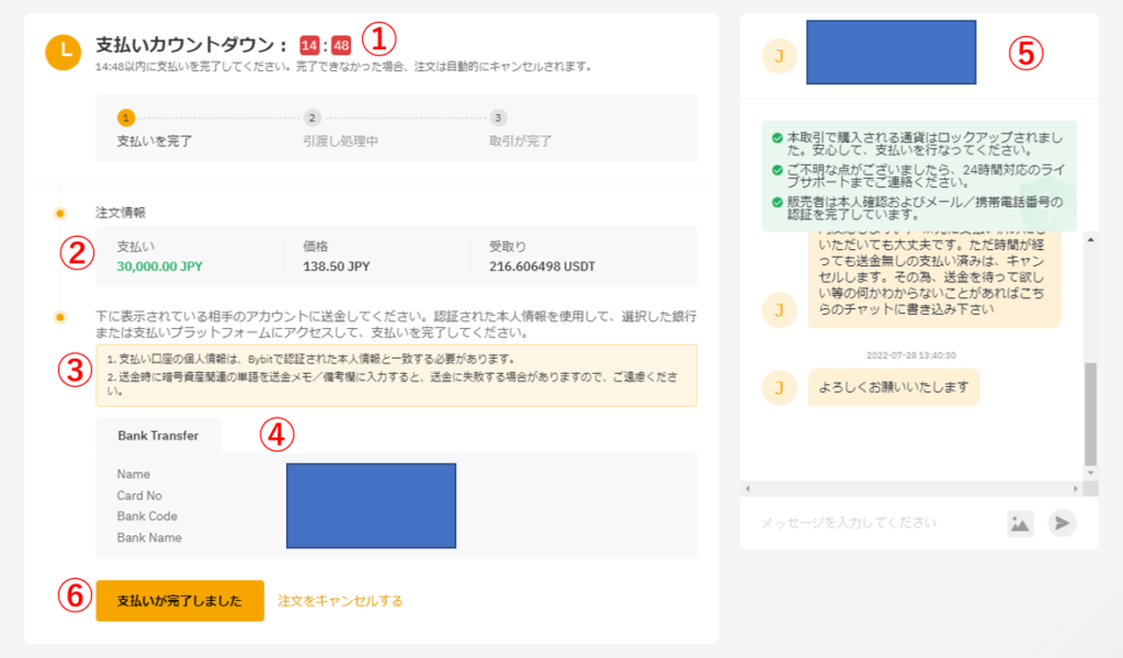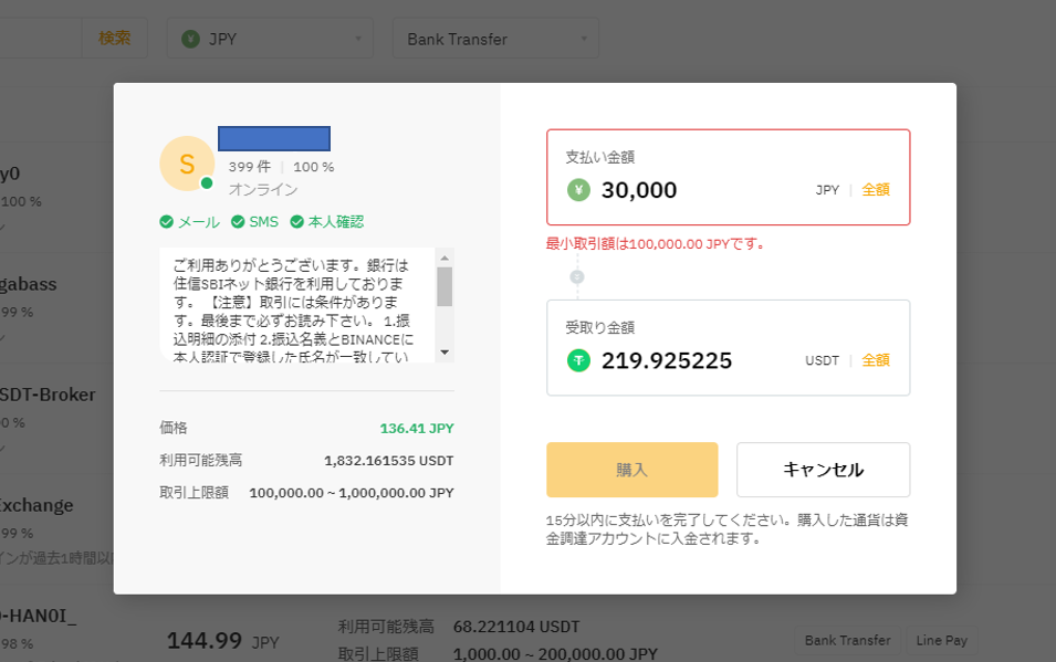 更にUSDTを購入をクリックすると広告主からの案内があり、どこの銀行に振り込むかなど詳細が見れる事もあります。