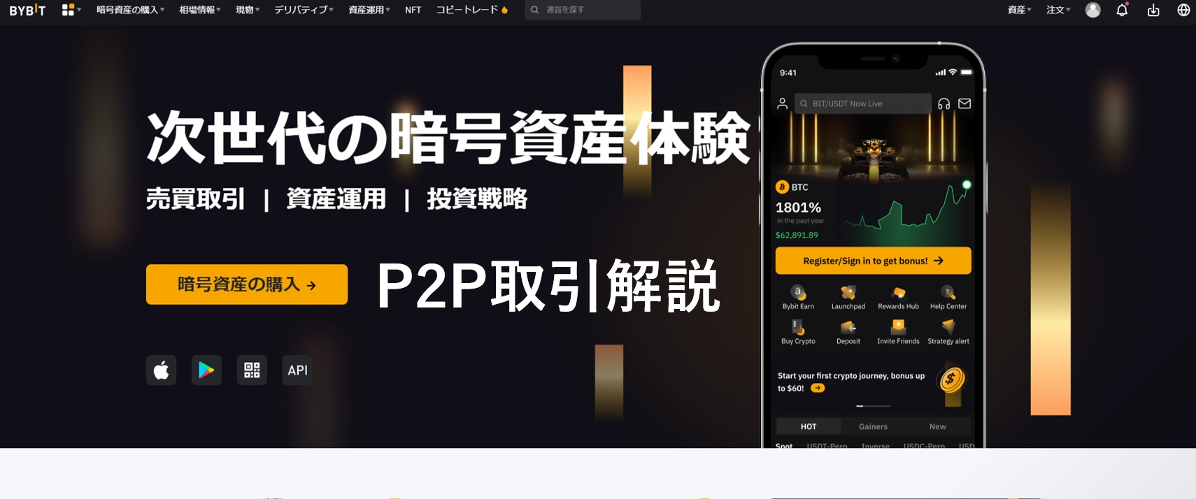 バイビットにログインした状態で画面左上の暗号資産の購入からP2P取引を選択