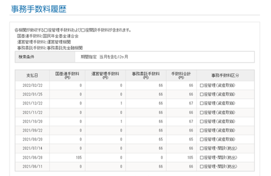 ちなみにこちらは事務手数料の履歴です。手続きを始めた11月から拠出していない2月現在も毎月66円の事務手数料が資産を取崩して支払われています((´;ω;`))