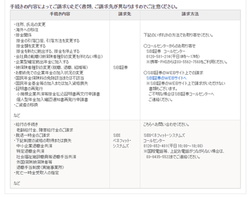 SBI証券は運営管理機関ですが業務の一部をSBIベネフィット・システムズに委託しています。請求内容によって申請先が変わります。脱退一時金の請求をしたかったのでSBIベネフィット・システムズに電話をした所、その前に提出が必要な書類がSBI証券側である事が判明しました。