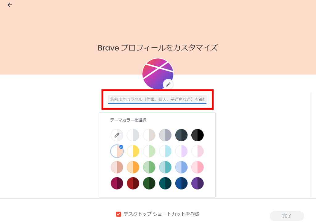名前・テーマカラーを設定します。ショートカットを作成すると簡単にこのブラウザを開くことができます。後で設定画面からも変更可能です。