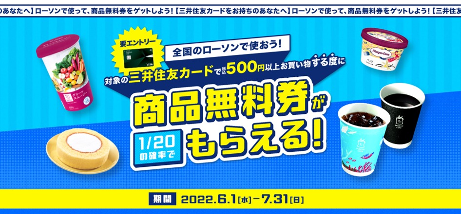 三井住友カードを使ってローソンで500円以上買い物すると、1/20の確率で商品無料券が貰える!