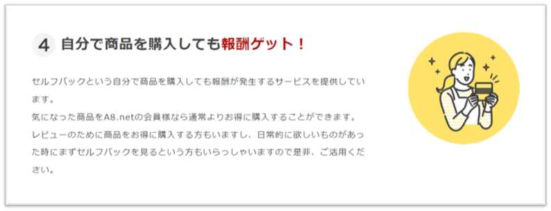 A8.netのサービスには、自分の買い物で報酬を貰えるセルフバック