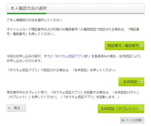 本人確認の方法を選びます。ゆうちょ認証アプリでなければ一番上を選択。