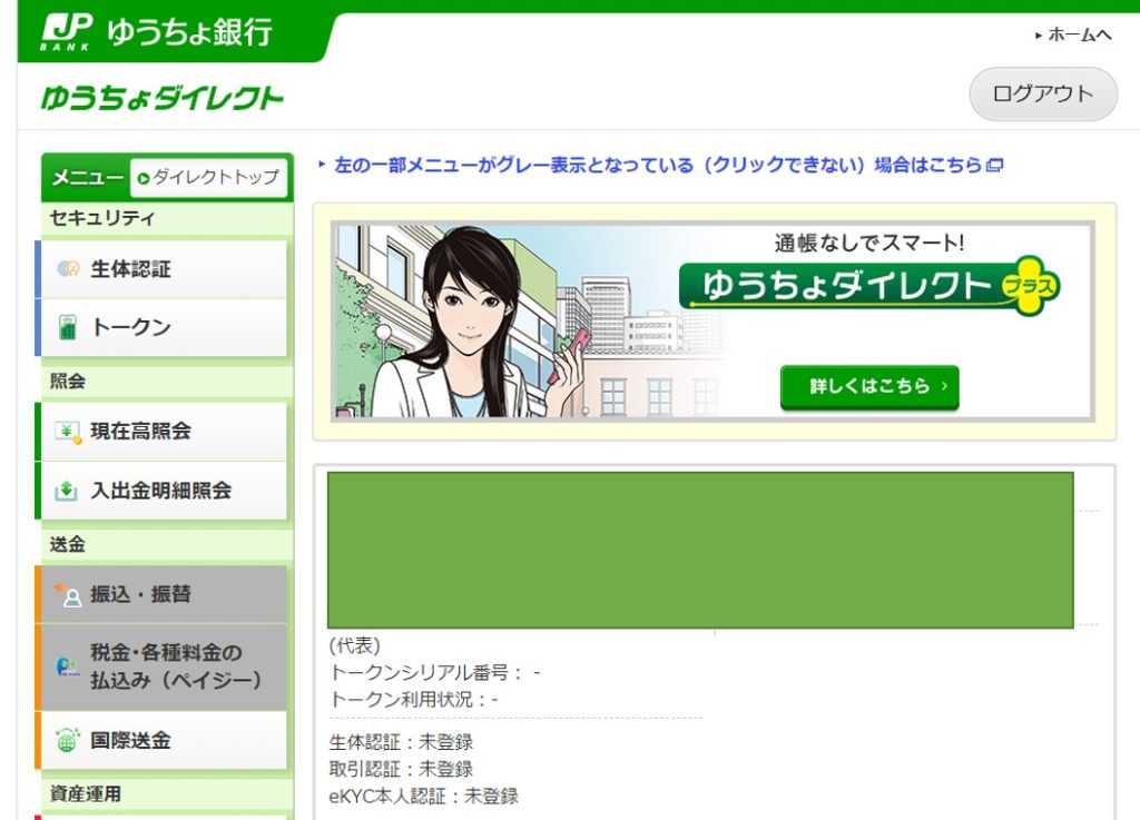 ゆうちょダイレクトの新規申込が完了しました。メニューを見るとグレーの表示部分がありますが、その他のメニューは使えます。