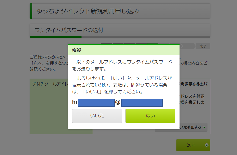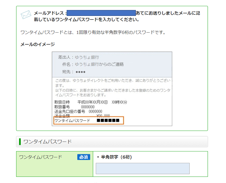 内容確認が済んだら登録したメール宛てにワンタイムパスワードを送信します