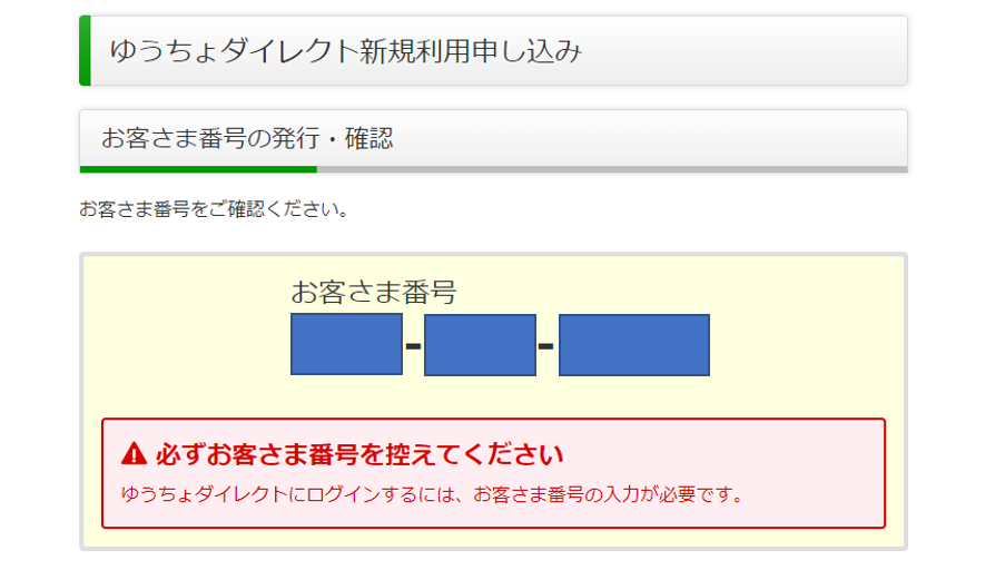 4桁-4桁-5桁の番号が発行されました。先ほど設定したパスワードとこのお客様番号を使ってログインするので忘れないようにしましょう。